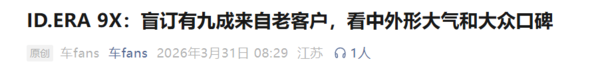 该销售顾问总结指出,盲订客户的核心关注点主要有四点:一是外观大气、颜值高,所有下订的客户最统一的观点就是这个;二是品牌口碑,盲订客户多为上汽大众老车主,涵盖辉昂、途昂、帕萨特、途观等车型用户;三是增程器和电池,ID.ERA 9X增程器的噪音控制和宁德时代电池的续航表现获得客户认可;四是空间宽敞和高配置。